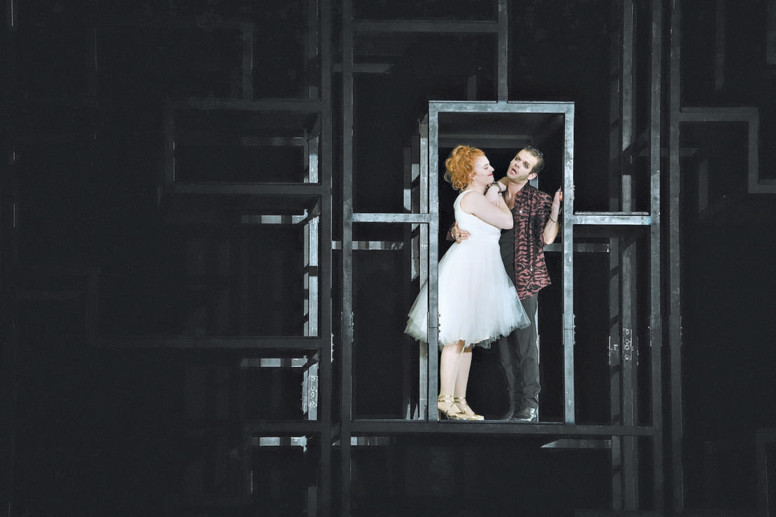 而前后兩道晃眼的“流蘇幕”,簡直就是德國魏瑪時代紙醉金迷、浮夸淫靡之社會風氣、文化氛圍最準確的象征,一旦撤掉燈光照射,溢彩流光馬上黯然零落如敗絮。至于燈光的運用,那更是要言不煩地豐富了舞臺表現(xiàn)力。